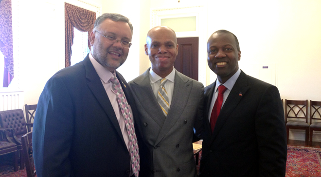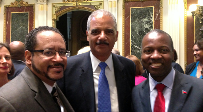 From right: Ambassador Paul Altidor with US Attorney General, Eric Holder and Dr. Michael Eric Dyson at the White House swear-in ceremony of new US Ambassador to South Africa, Patrick Gaspard