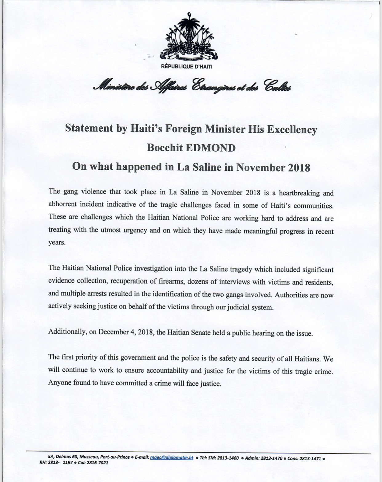 Statement by Haiti’s Foreign Minister, His Excellency Bocchit Edmond, on the situation in La Saline